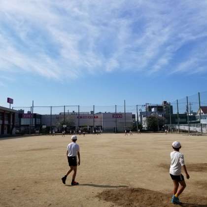 朝から良い天気です。運動場で走り回っています。(6の2 体育)
