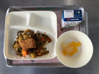 「カツカレーライス・フルーツゼリー・牛乳」です。