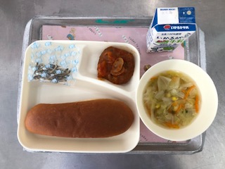 18日「煮こみハンバーグ・野菜スープ・ミニフィッシュ・黒糖パン・牛乳」です。