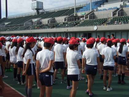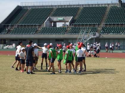 午後には、長居スタジアムへ移動し、100m走、400mリレー、400m走をしました。