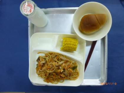 今日の献立は、2分の1黒糖パン、きのこのスパゲッテイ、焼きとうもろこし、牛乳です。