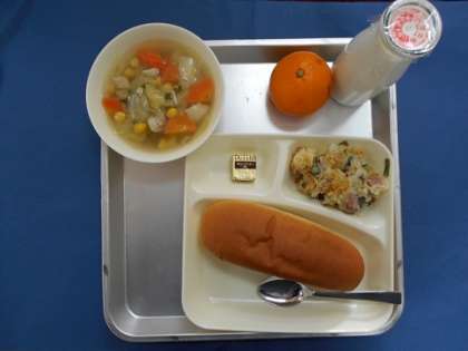 今日の献立は、コッペパン、バター(キューブ)、ほうれん草のグラタン、スープ煮、みかん、牛乳です。