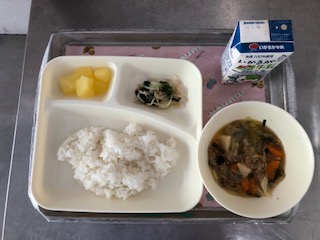 献立は「中華煮・チンゲンサイともやしのしょうがあえ・りんご(カット缶)・ごはん・牛乳」です。中華煮には、豚肉のほかにキャベツ、たまねぎ、たけのこ、にんじん、にらと野菜がたっぷりです。