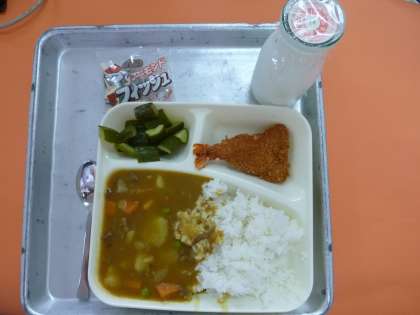 今日の献立は、えびフライカレー、きゅうりのピクルス、アーモンドフィッシュ、牛乳でした。
