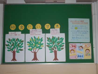 給食の返却時、おかずの缶を見て、残食がない場合、画用紙で作ったりんごが学級で1つもらえます。