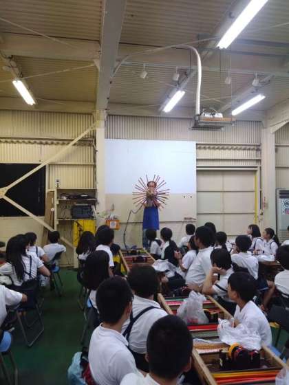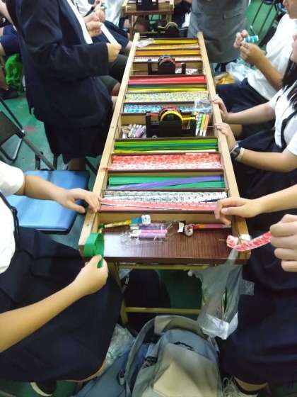 吹き戻しの里で、説明を聞いて、吹き戻しを作りました。この工場で全国の90%を生産しているそうです。みんな上手く製作できています。宿泊するホテルに向かいます。