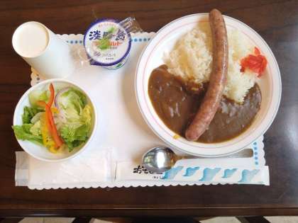 班別の見学を終え、ファーマーズキッチンに集合しました。大きなウインナーのカレーです。