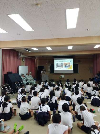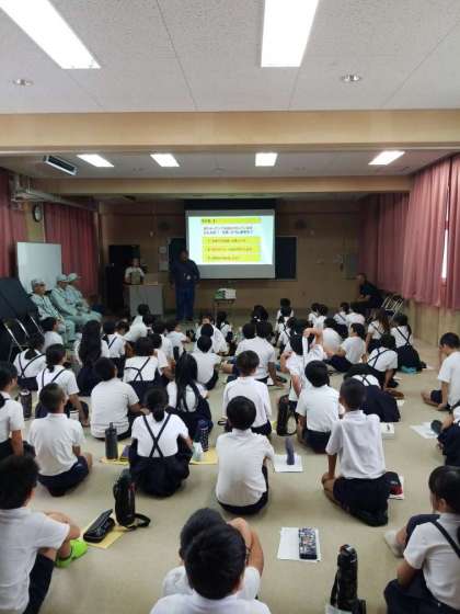 区役所、および加美北地域の防災リーダーの方に来ていただき、災害時に備えた防災学習を行いました。クイズ形式で防災時の動き方を確認したり、各地域に分かれて、地図を広げながら防災リーダーの方と危険個所の確認も行ったりしました。