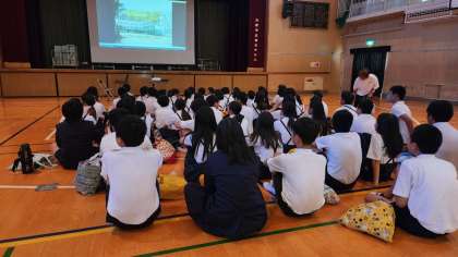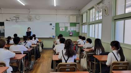 生徒会からの中学校生活の説明後、クラスごとに英語、家庭科の授業を体験しました。