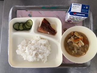 献立は「あかうおのしょうゆだれかけ・豚汁・きゅうりのゆず風味・ごはん・牛乳」です。