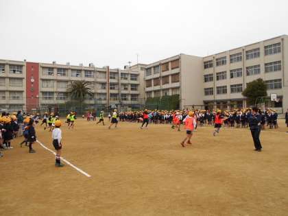 たてわり集会で、赤玉を使ってリレーをしました。1年生から6年生まで、仲よく協力して活動しようというめあてで取り組みました。子どもたちの笑顔からめあては達成したようです。