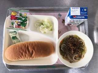 昨日はの献立は「タンタンめん・あっさりキャベツ・豆こんぶ・コッペパン・ソフトマーガリン・牛乳」です。タンタンめんは、野菜の入っためんに肉みそをのせます。