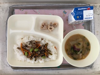 今日は「もずくと豚ひき肉のジューシー・さつまいものみそ汁・焼きれんこん・牛乳」です。