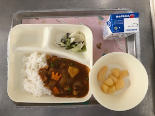 献立は「ハヤシライス・キャベツのひじきドレッシング・白桃(カット缶)・牛乳」です。