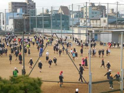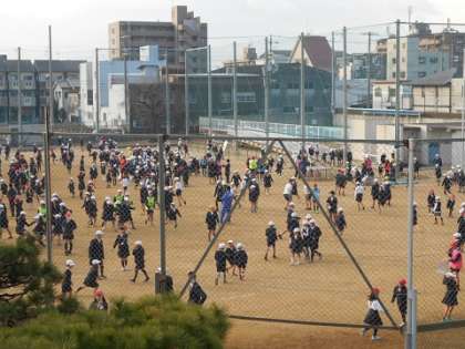 たてわり班でおにごっこをしました。運動場をみんな元気に走り回っています。