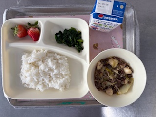 今日27日の献立は「すき焼き煮・ほうれんそうのおひたし・いちご・ごはん・牛乳」です。いちごも甘くて大変好評でした。