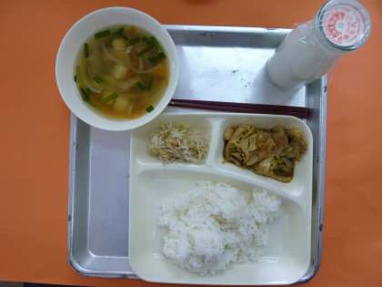今日の献立は、ご飯、ホイコウロー、海老と豆腐のスープ、もやしの甘酢あえ、牛乳でした。