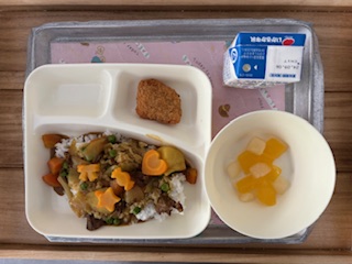 「カツカレーライス・フルーツゼリー・牛乳」です。