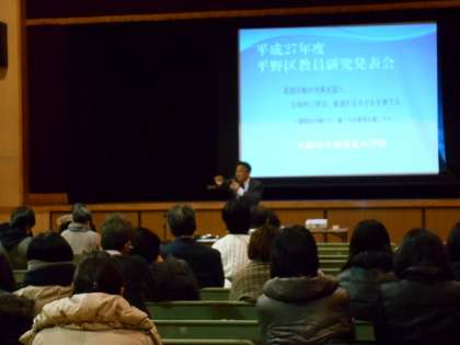 平野区の教員研究発表会が加美北小学校の講堂でありました。