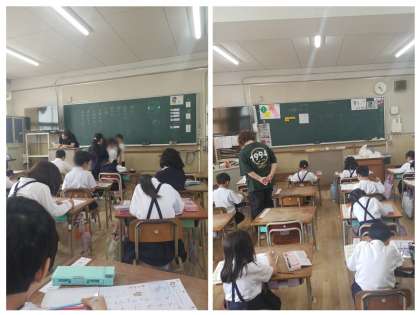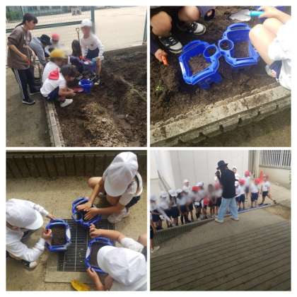 2年 生活 学習園の土を入れて、植物の栽培の準備。今年は、ミニトマトやオクラを栽培予定です。