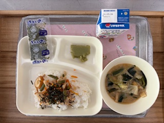 献立は「かやくごはん、みそ汁・まっ茶ういろう・牛乳」です。
