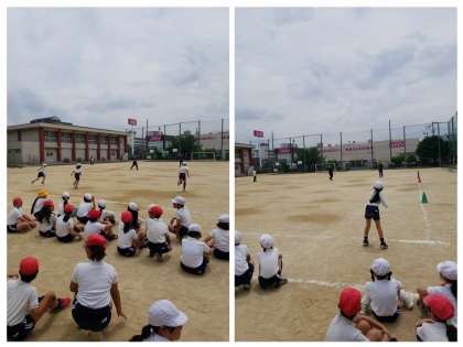 スポーツテストに向けて、ソフトボール投げの練習です。