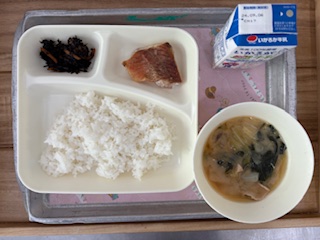 今日は「あかうおのしょうゆだれかけ・みそ汁・ひじきのいため煮・ごはん・牛乳」です。
