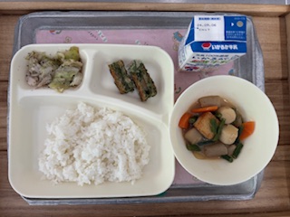 昨日の献立は「ちくわのいそべあげ・あつあげとさといものみそ煮・キャベツの赤じそあえ・ごはん・牛乳」です。