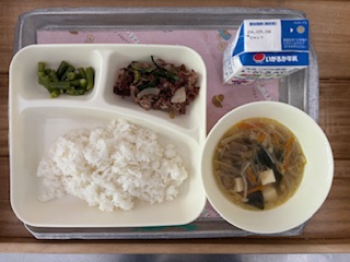 今日は「プルコギ・とうふとわかめのスープ・さんどまめのナムル・ごはん・牛乳」です。