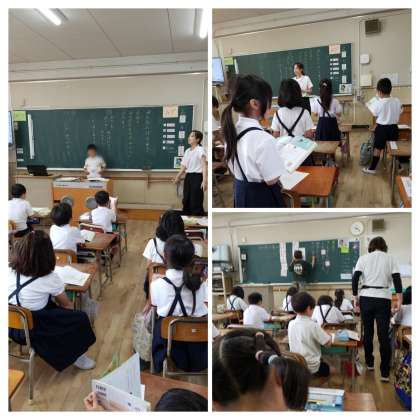 続けて、学校で見つけたことを伝える学習です。「私がみつけたものはなんでしょう。ヒントは○○です。」前に出てみんなの前で発表します。