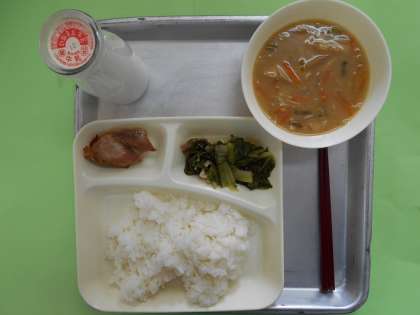 今日の献立は、ご飯、鶏肉の柚塩焼き、味噌汁、大阪白菜の煮びたし、牛乳です。