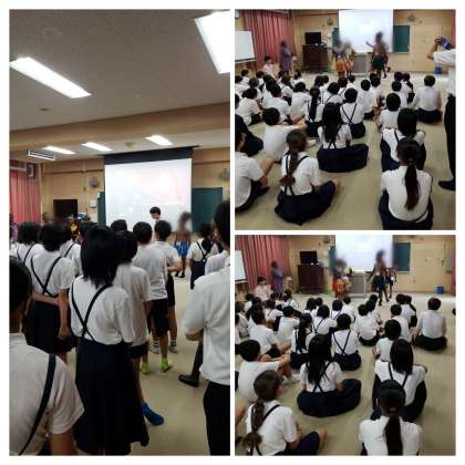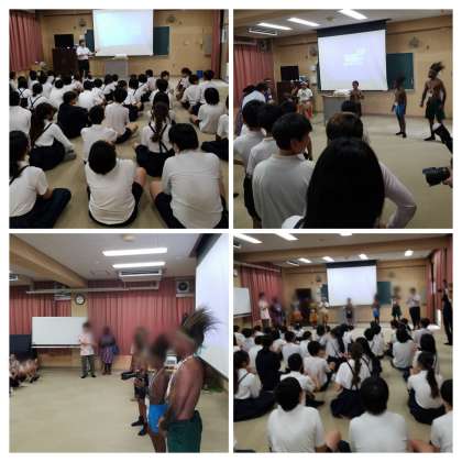 児童朝会(テレビ)で6名の児童が自己紹介。その後、多目的室であらためて自己紹介。民族舞踊の披露、互いの国歌斉唱などを行いました。