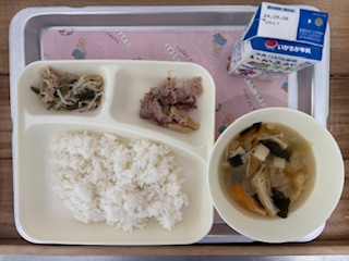 献立は「豚肉のしょうが焼き・五目汁・ツナと野菜のいためもの・ごはん・牛乳」です。