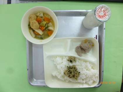 今日の献立は、ご飯、豚肉のねぎだれかけ、里芋と野菜の煮物、ツナっぱ炒め、牛乳です。