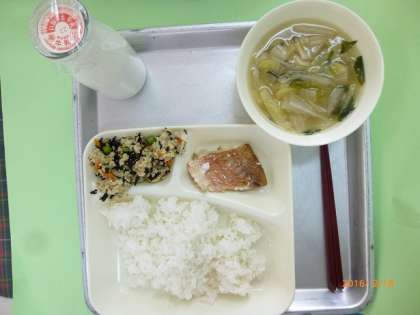 今日の献立は、ご飯、赤魚のレモン醤油かけ、うす葛汁、高野豆腐のいり煮、牛乳です。