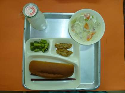今日の献立は、黒糖パン、白菜のクリーム煮、揚げ餃子、あっさりきゅうり、牛乳でした。