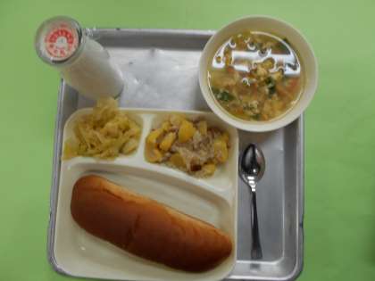 今日の献立は、黒糖パン、中華おこわ、玉子スープ、キャベツのオイスターソース炒め、牛乳です。