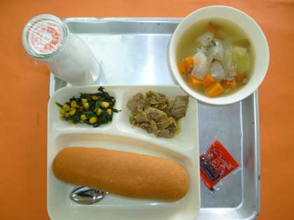 10月28日(月)の献立は、豚肉のカレー風味焼き、じゃがいものスープ煮、ほうれん草のソテーでした。