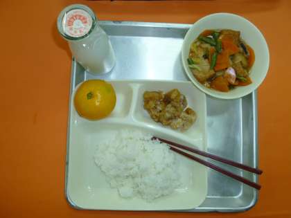 10月29日(火)の献立は、あげどりのねぎソースかけ、いかと白菜のうま煮、みかんでした。