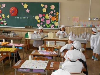 メニューは、焼きそばです。先生と一緒に配膳をします。