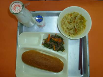今日の献立は、ごまパン、牛肉と三度豆のソテー、トマトのスープスパゲッティ、はっこう乳、牛乳です。