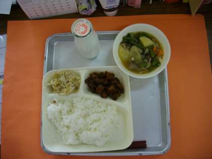 今日の献立は、ご飯、くじらのオーロラ煮、じゃがいもと野菜の煮物、もやしの柚子のかあえ、牛乳でした。