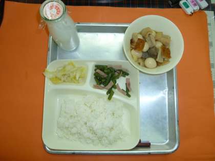 今日の献立は、ご飯、関東煮、白菜の甘酢づけ、ハムと三度豆の炒め物、牛乳でした。