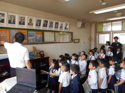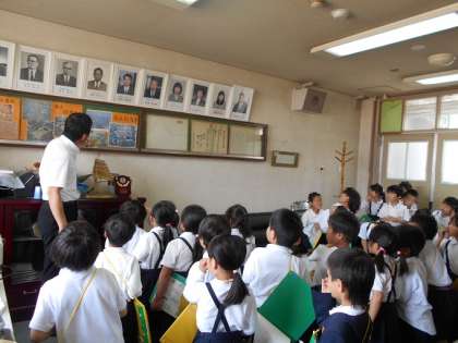 校長先生に、学校の写真を見せてもらって、お話を聞いていました。