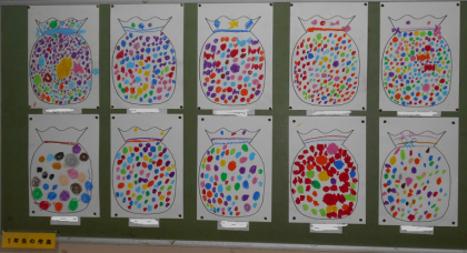 1年生の掲示板です。かわいいガラスの小瓶が並んでいます。