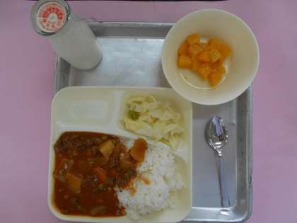 今日の献立は、ハヤシライス、キャベツのゆずドレッシング、黄桃(缶)、牛乳です。