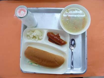 今日の献立は、コッペパン、ソフトマーガリン、フランクフルトのケチャップソース、コーンスープ、カリフラワーのピクルス、牛乳でした。
