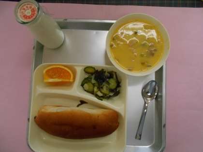 今日の献立は、レーズンパン、かぼちゃのクリームシチュー、ミックス海草サラダ、オレンジ、牛乳です。