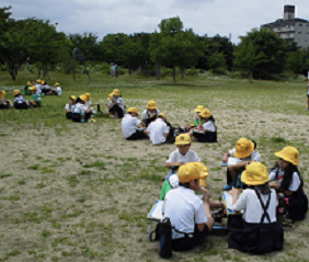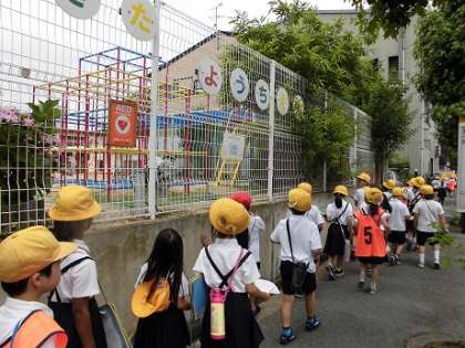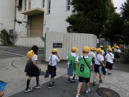 1回目の「校区探検」は、雨が降ってきて、途中で戻って来ましたが、今日はいい天気。子どもたちは、元気に校区探検に出発しました。