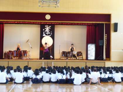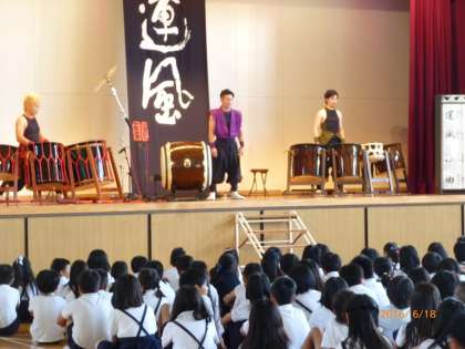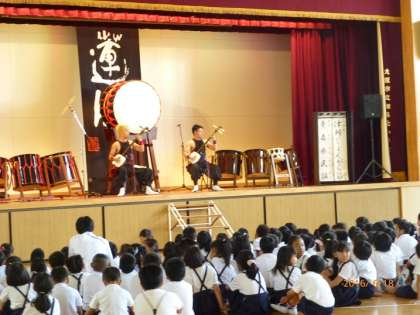 津軽三味線を使い沖縄音階で作った曲や、三宅島で今でも打たれている神着木造り太鼓という原曲をもとにした曲、打面3尺(直径90cm)超える世界最大の打楽器と呼ばれる日本の大太鼓の迫力ある響きに、子どもたちや、保護者も感動していました。
